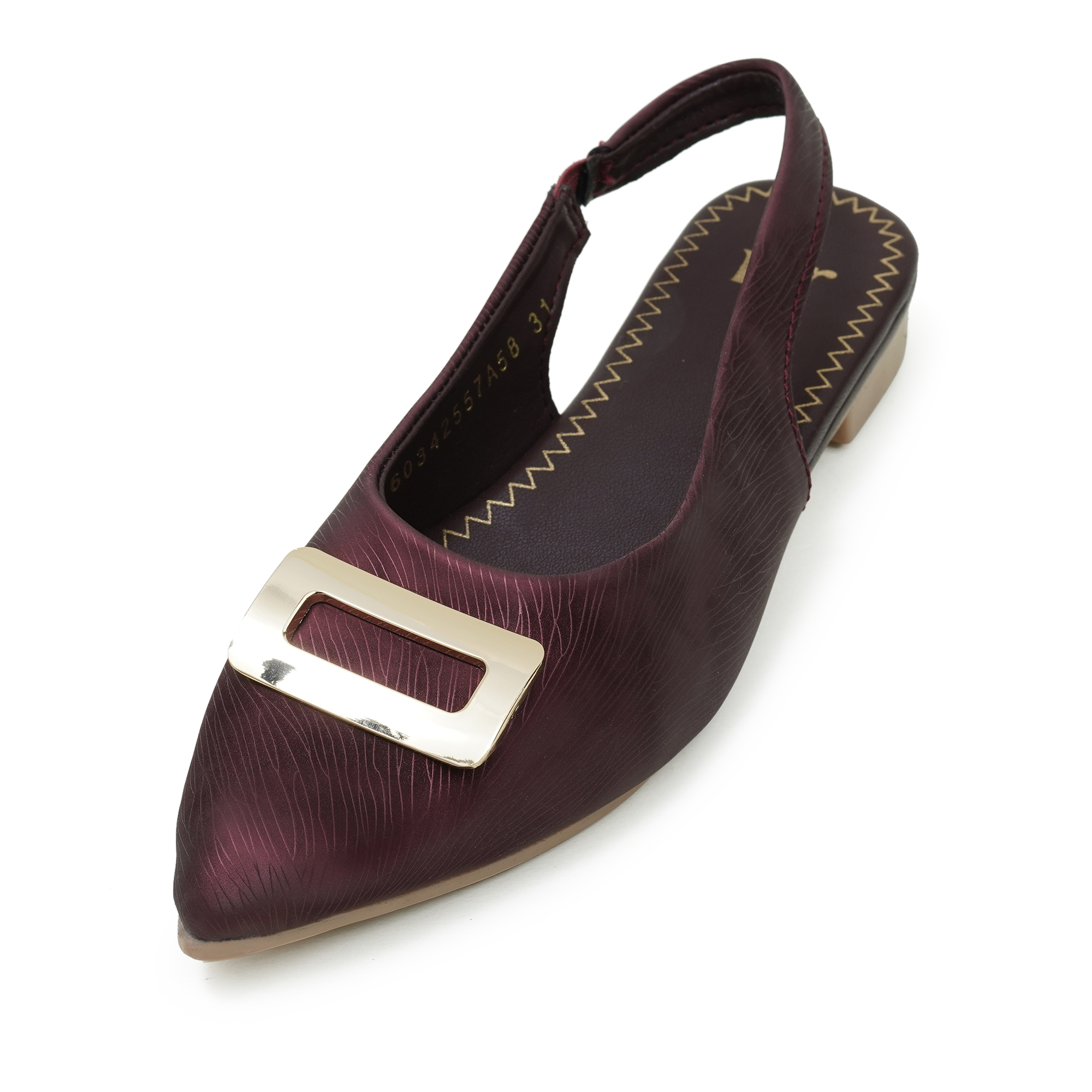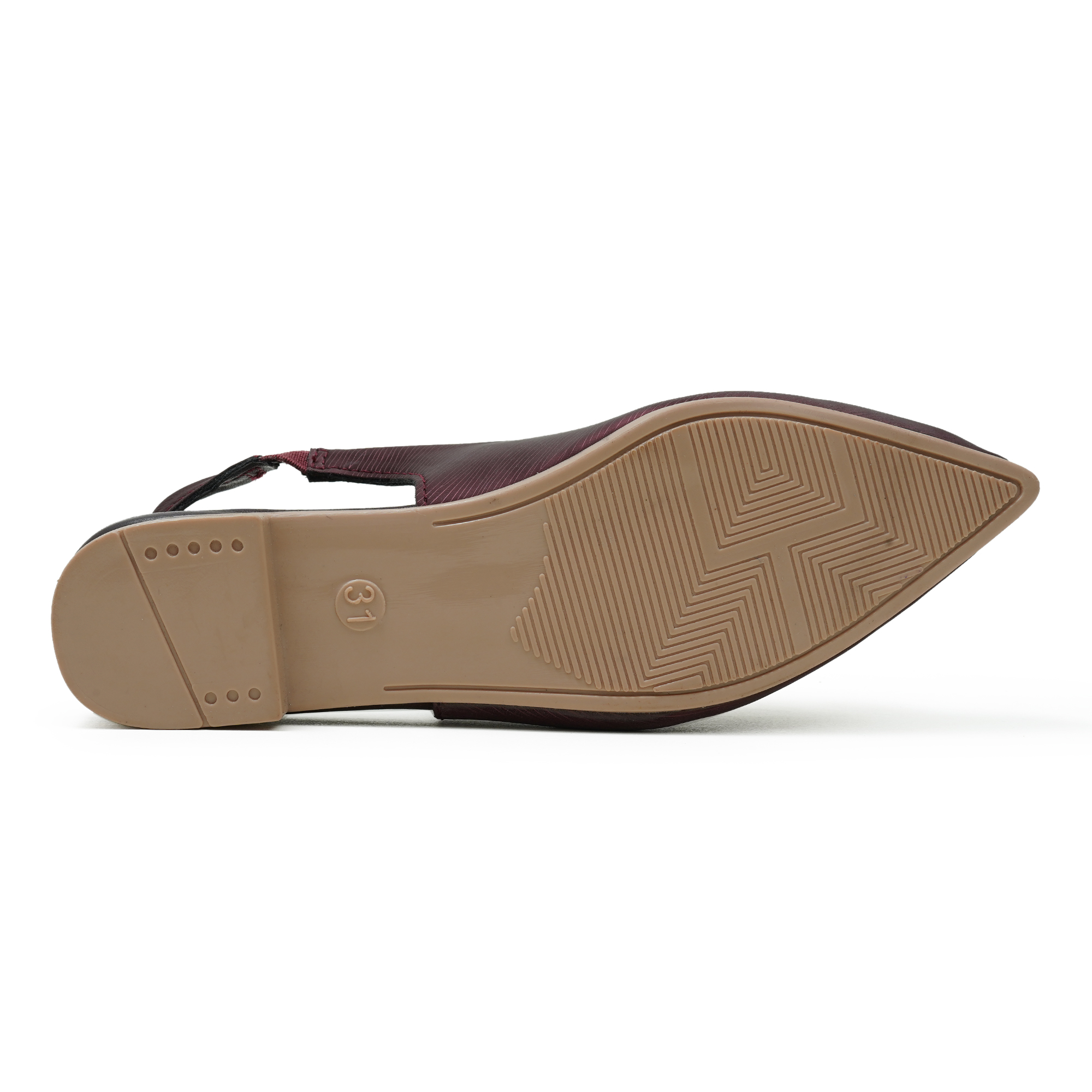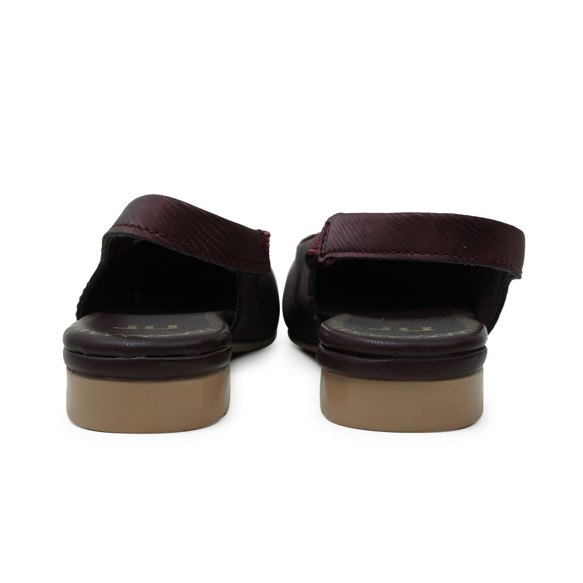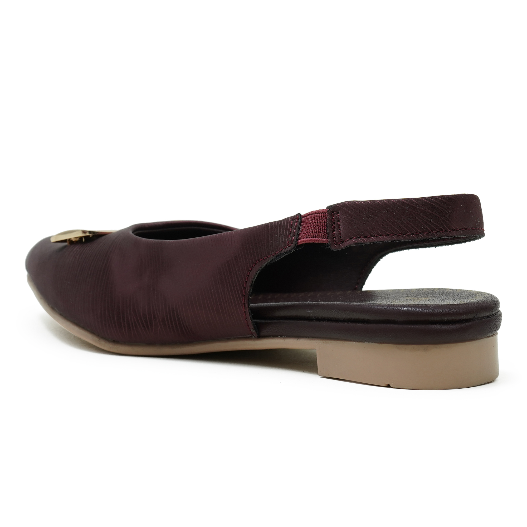 The maroon shade adds an elegant touch to party looks and special occasions. This stylish slip-on design comes with a comfortable backbelt (slingback) that helps keep the foot secure while walking. The upper features a premium textured finish and a sleek metal trim detail that enhances the overall look. With a soft cushioned insole and lightweight low heel, it offers all-day comfort with a smart, classy silhouette.