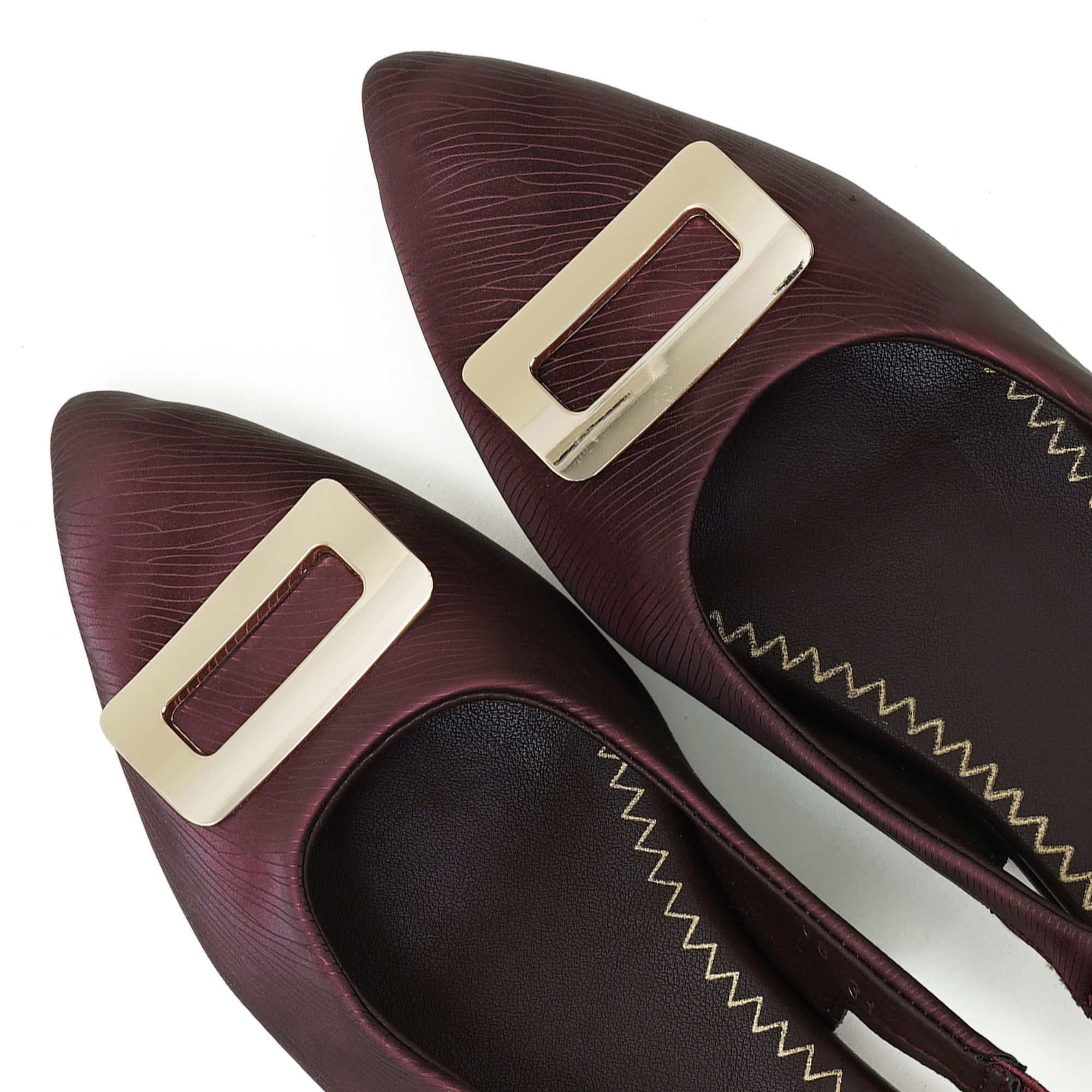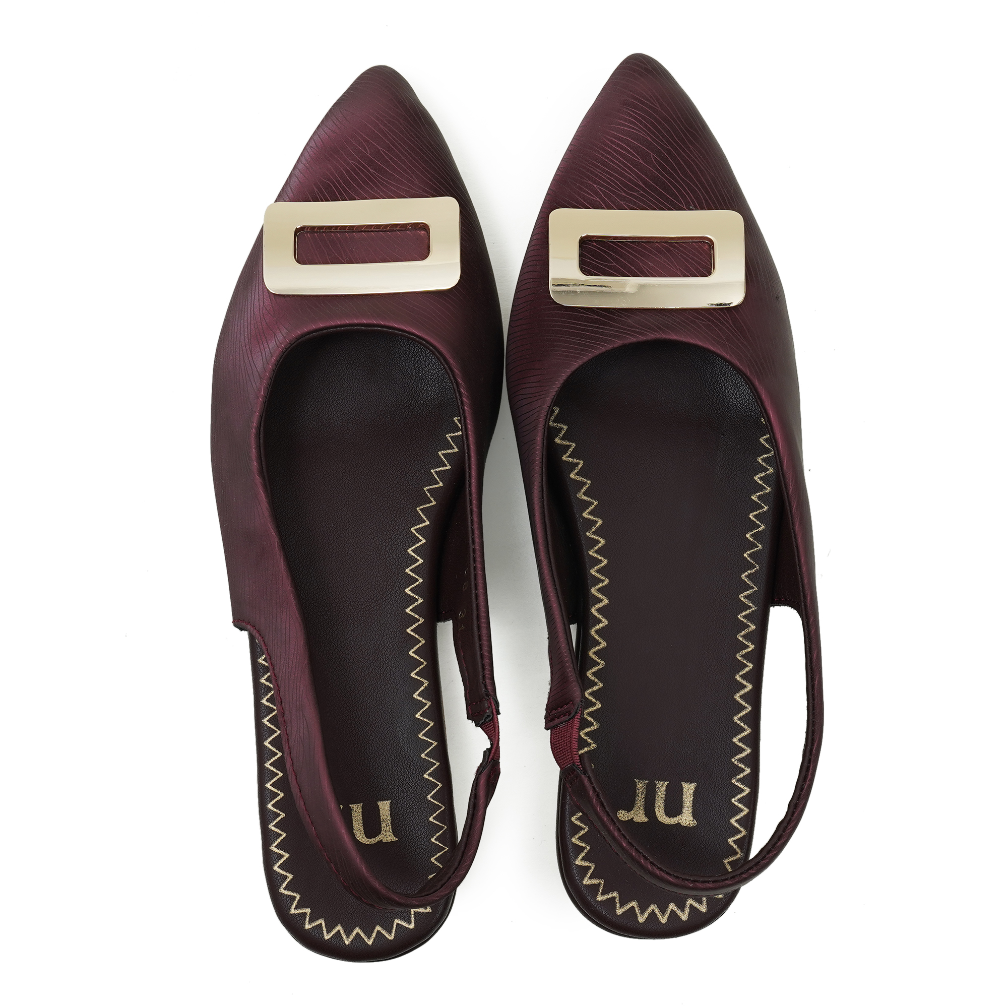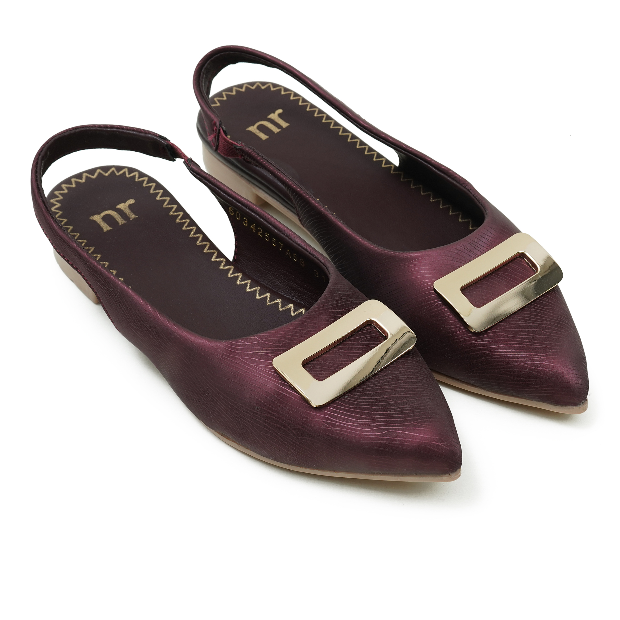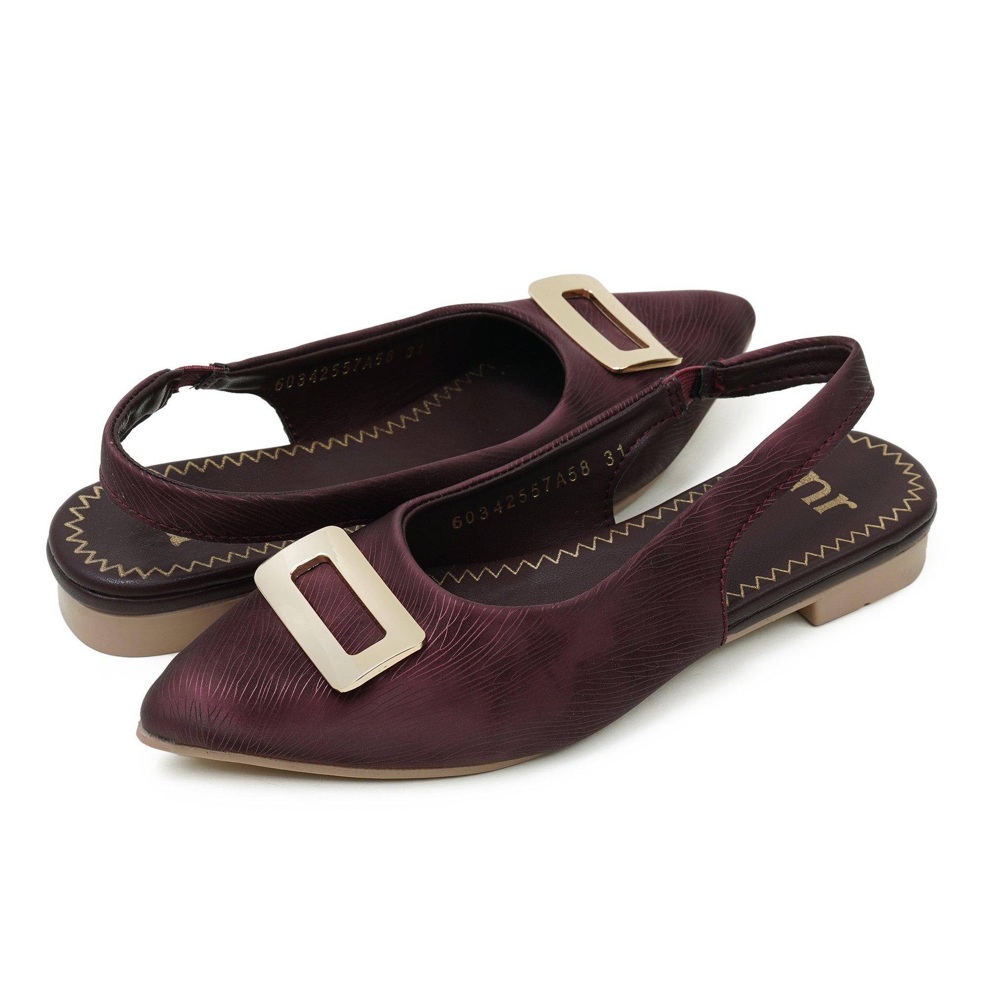 The maroon shade adds an elegant touch to party looks and special occasions. This stylish slip-on design comes with a comfortable backbelt (slingback) that helps keep the foot secure while walking. The upper features a premium textured finish and a sleek metal trim detail that enhances the overall look. With a soft cushioned insole and lightweight low heel, it offers all-day comfort with a smart, classy silhouette.