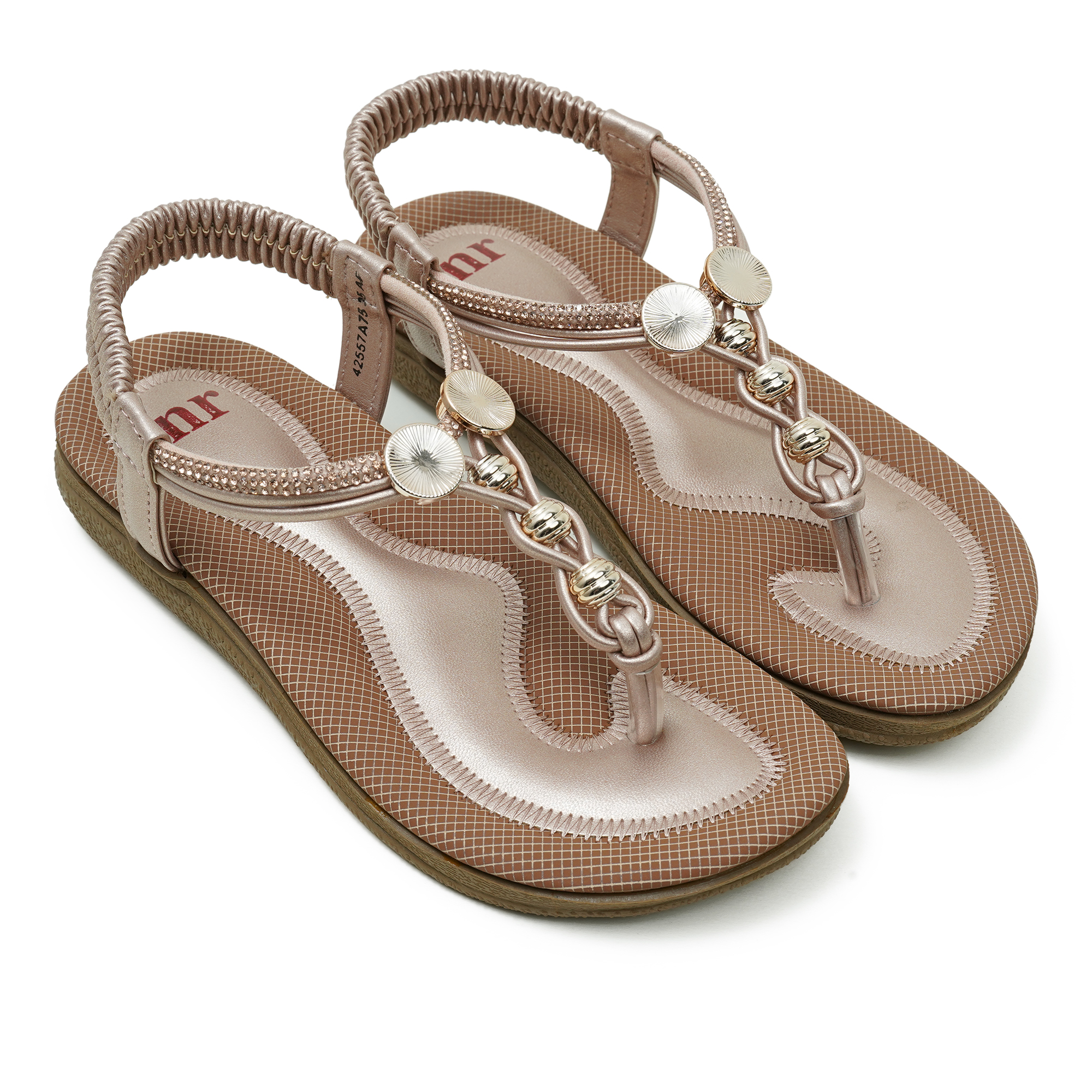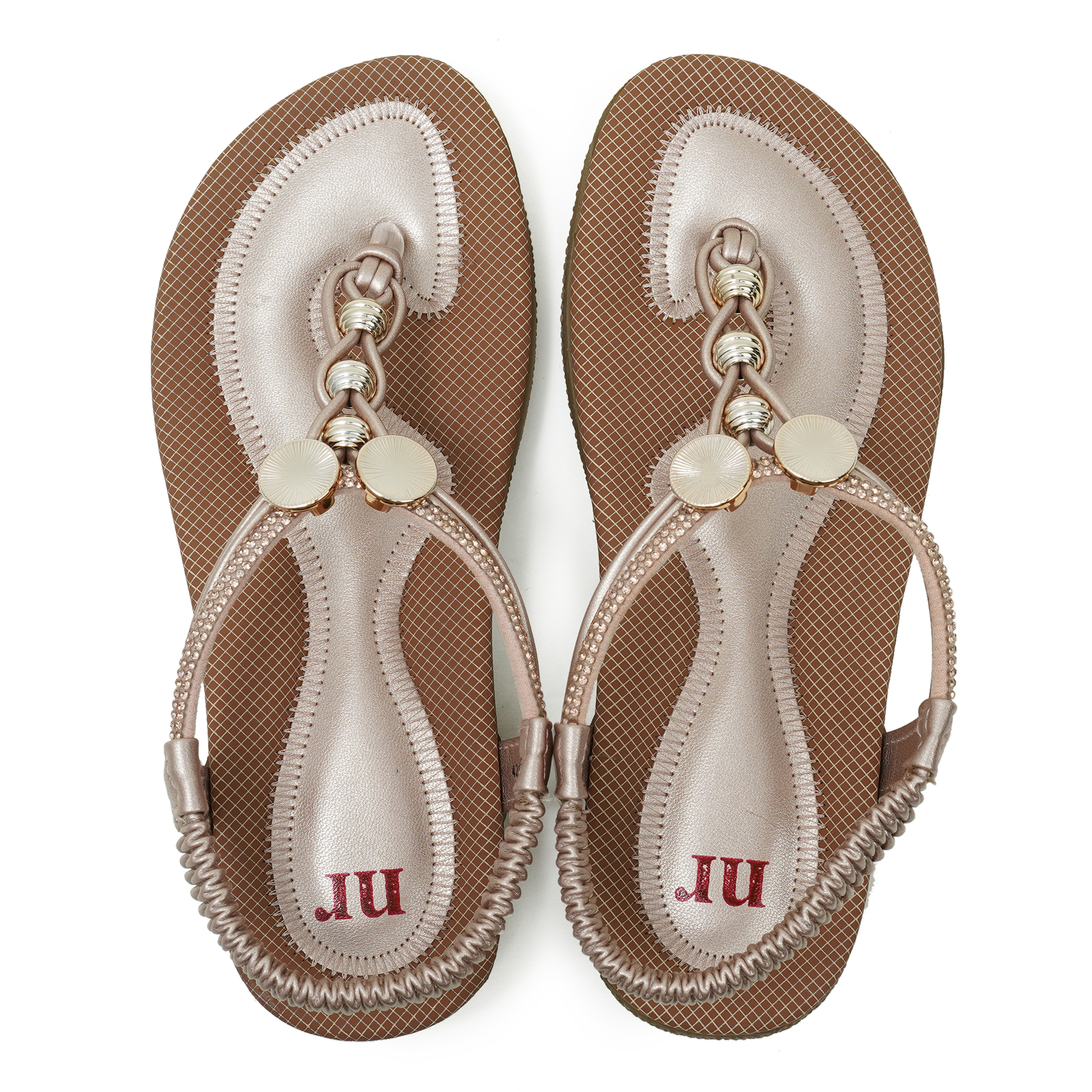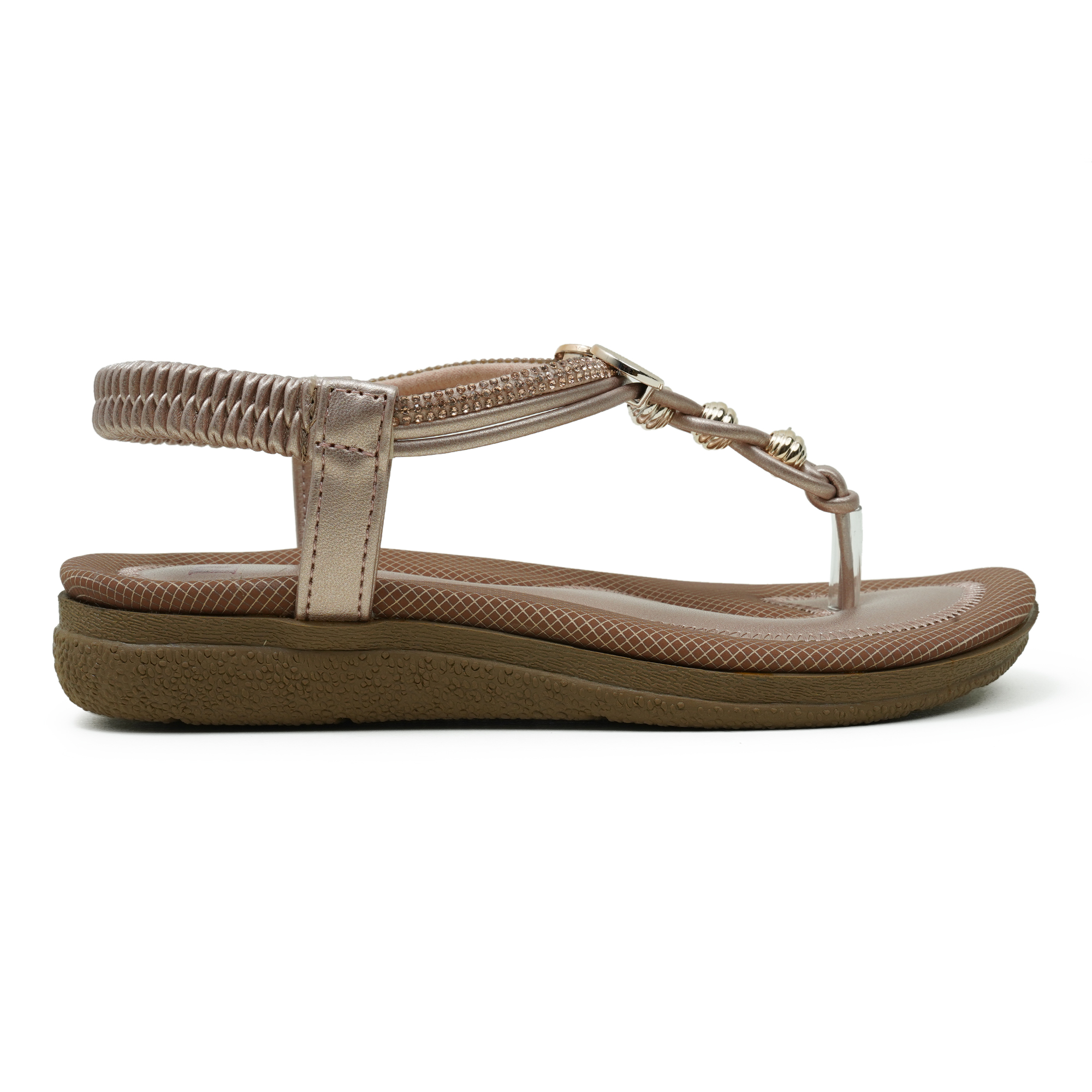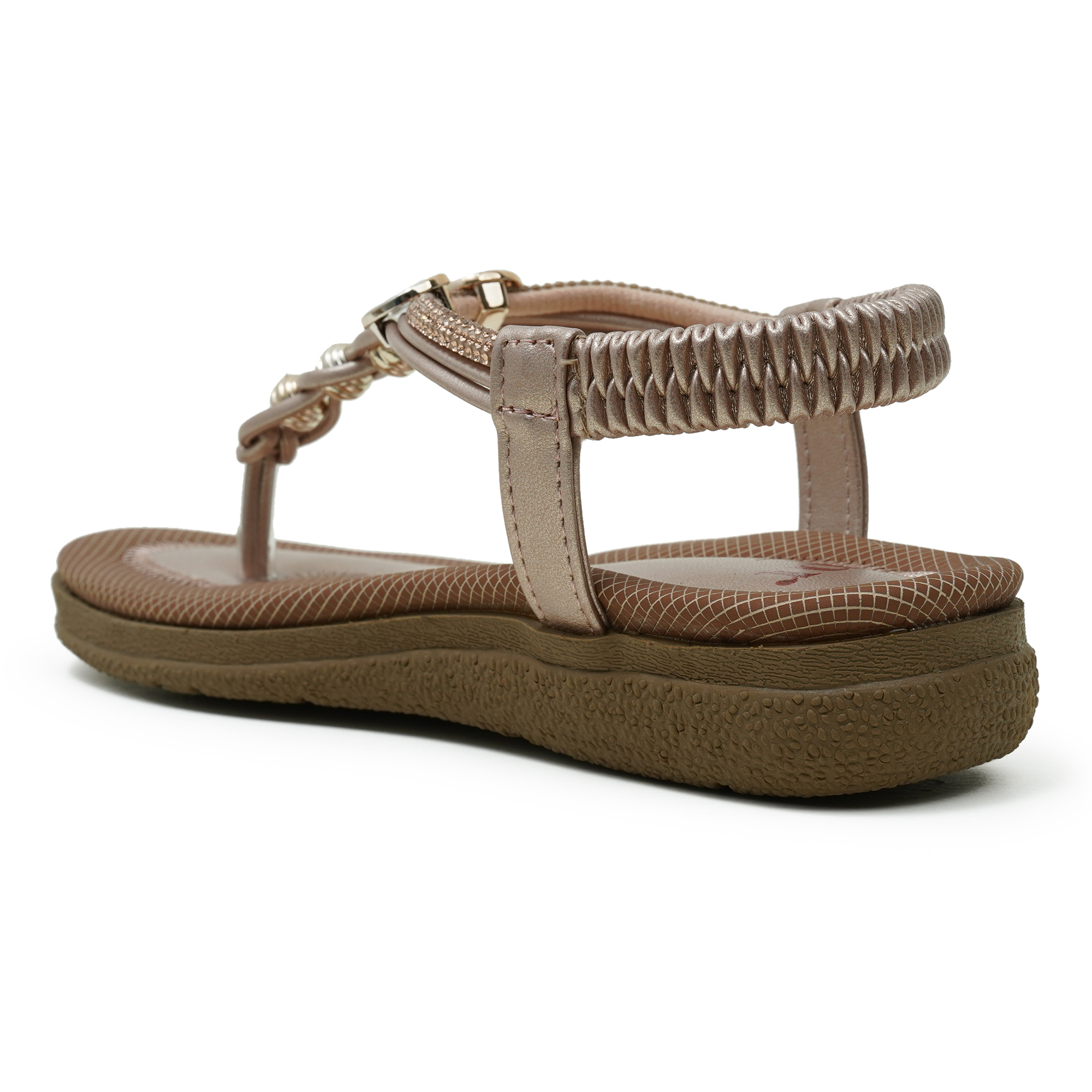 Twinkler’s sandal for girls mixes playful details with everyday comfort. The glossy champagne upper and braided T-strap are finished with shiny metallic discs and beads for a twinkling, dressy look that’s perfect for parties or casual outings. A soft cushioned footbed provides gentle support, while the elasticated backstrap makes it easy for little feet to slip on and stay secure during play. The lightweight textured outsole gives reliable traction, and neat stitched edging adds durability. Charming and practical, this sandal pairs beautifully with dresses, skirts, or summer shorts.