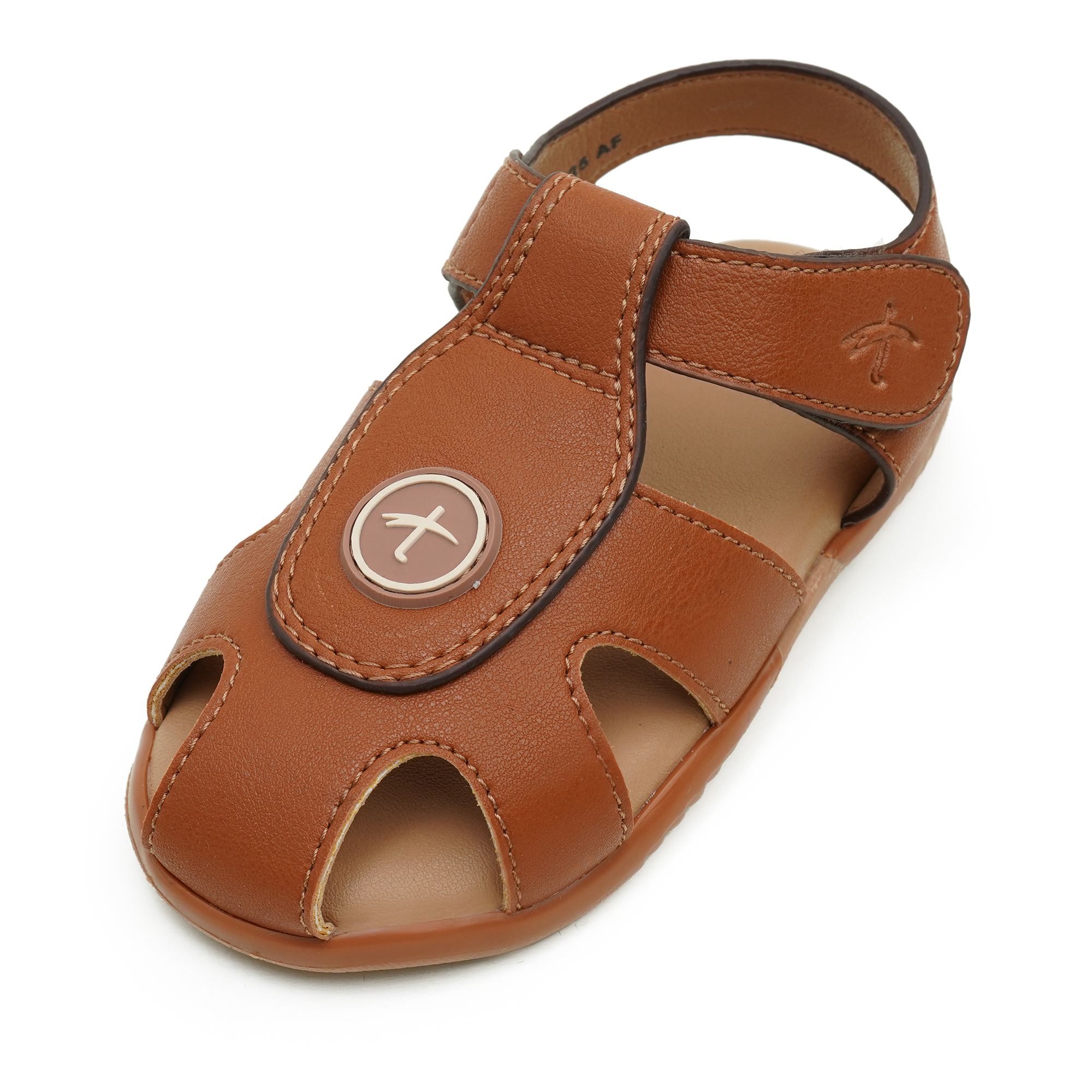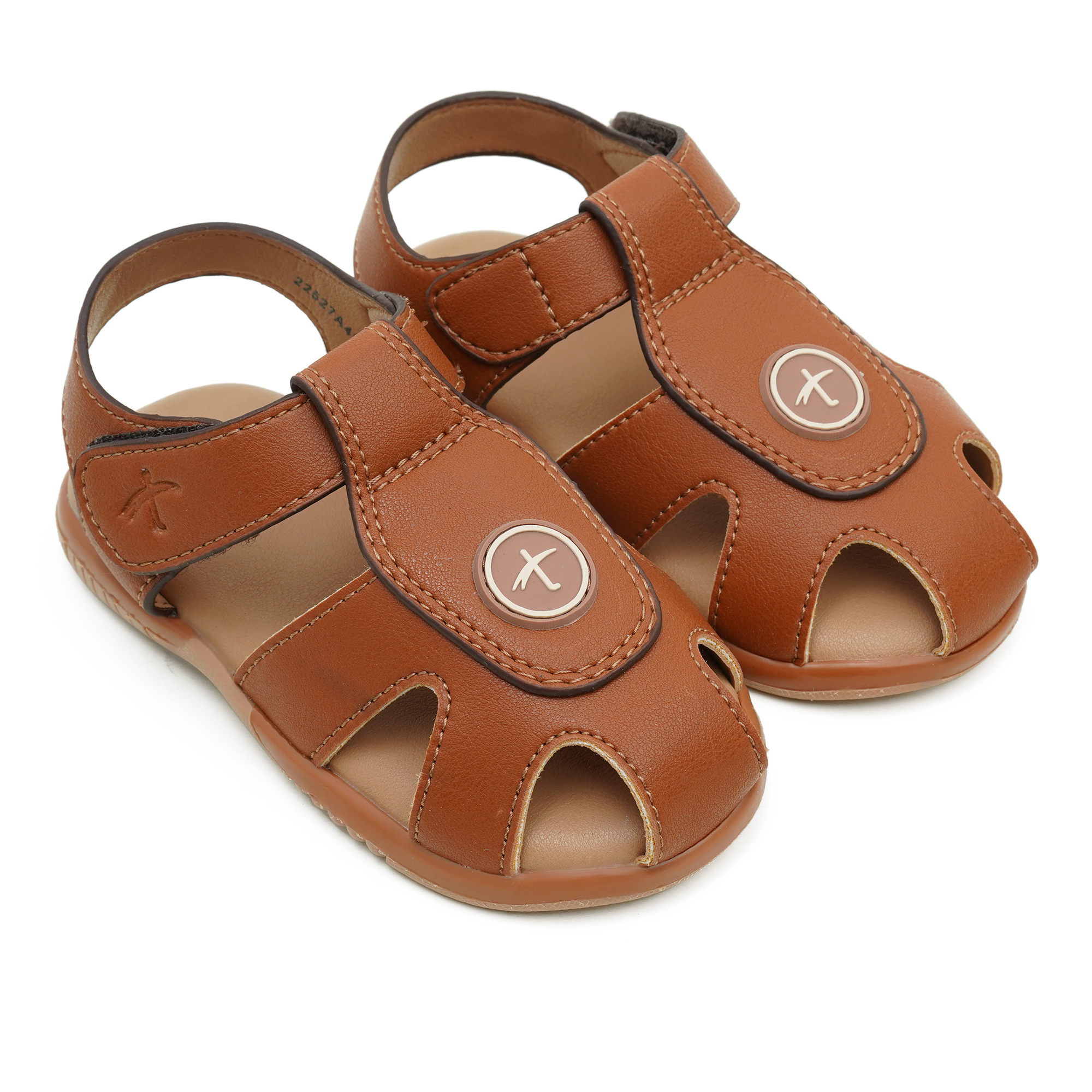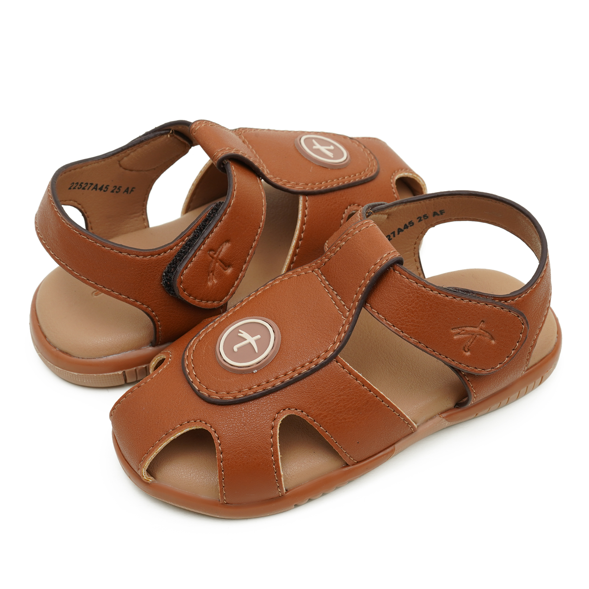 Designed for active little feet, this brown closed-toe sandal offers extra front protection with breathable side cut-outs. The adjustable hook-and-loop strap keeps the fit snug, while a cushioned footbed and flexible sole support comfy all-day steps.