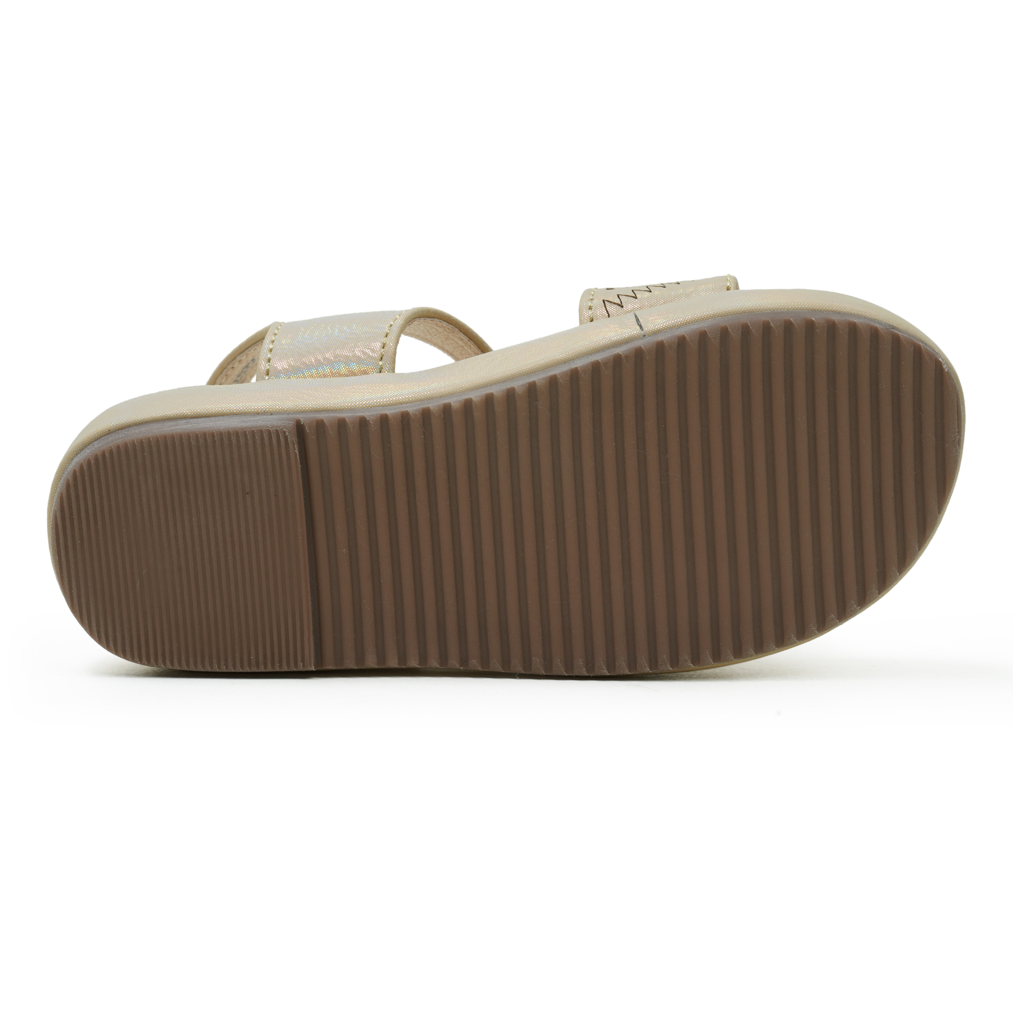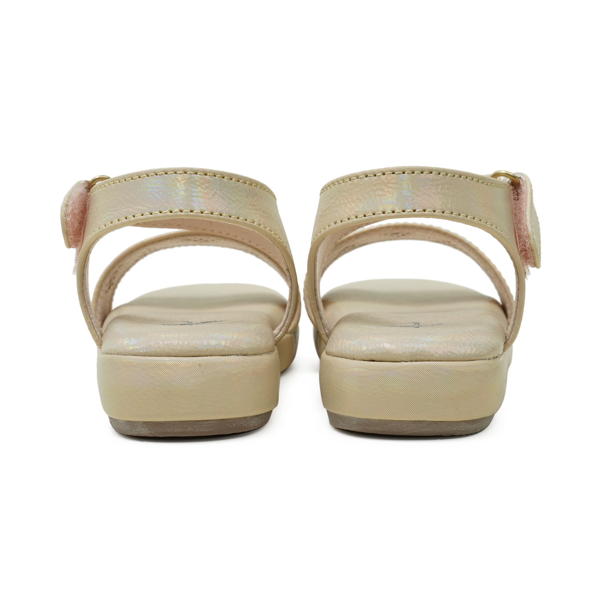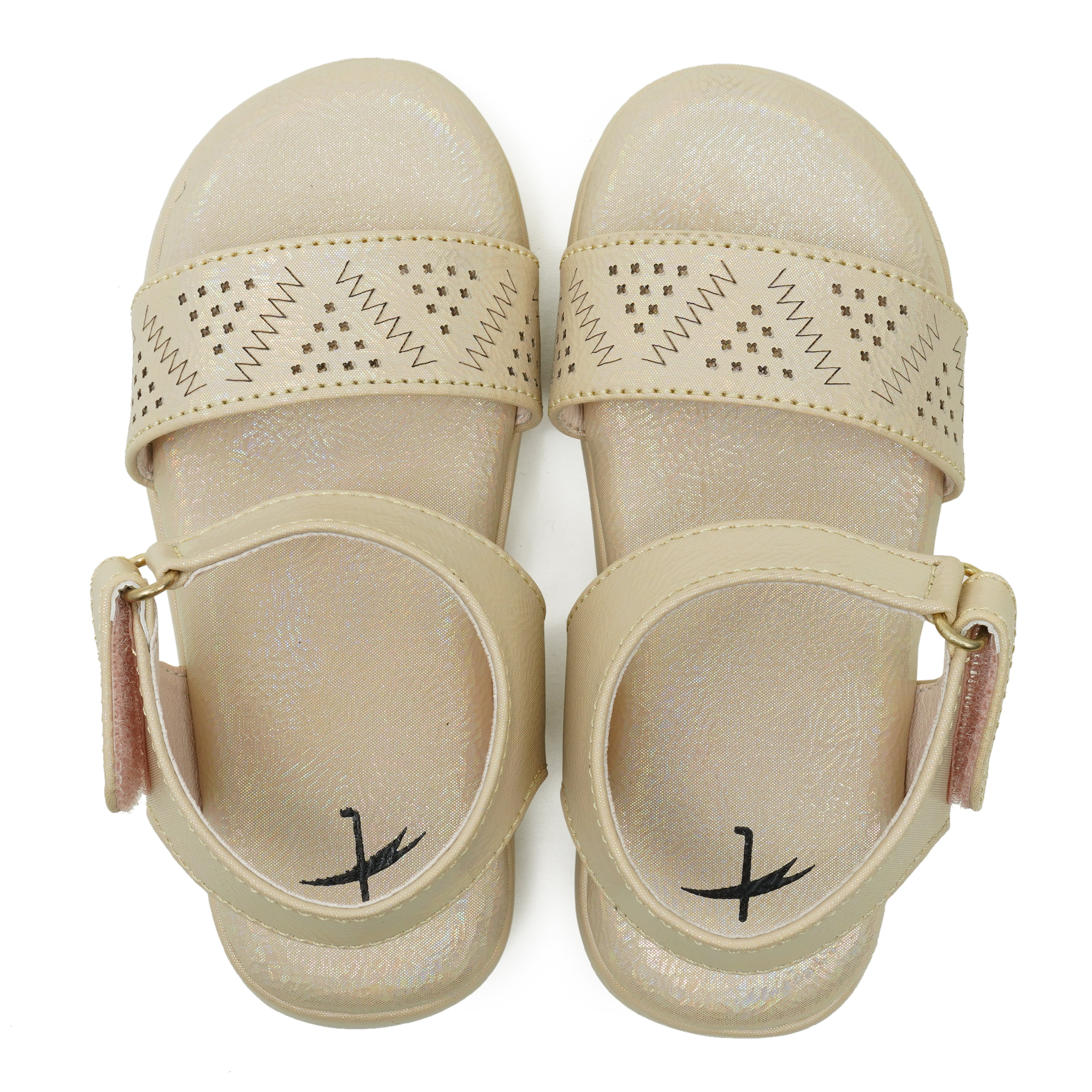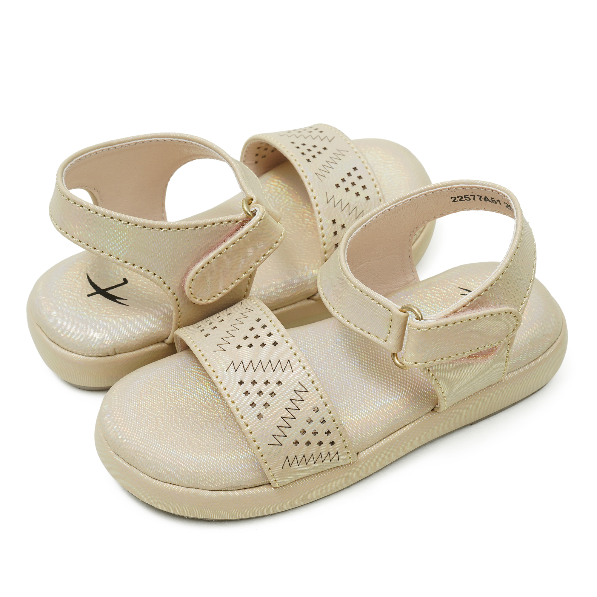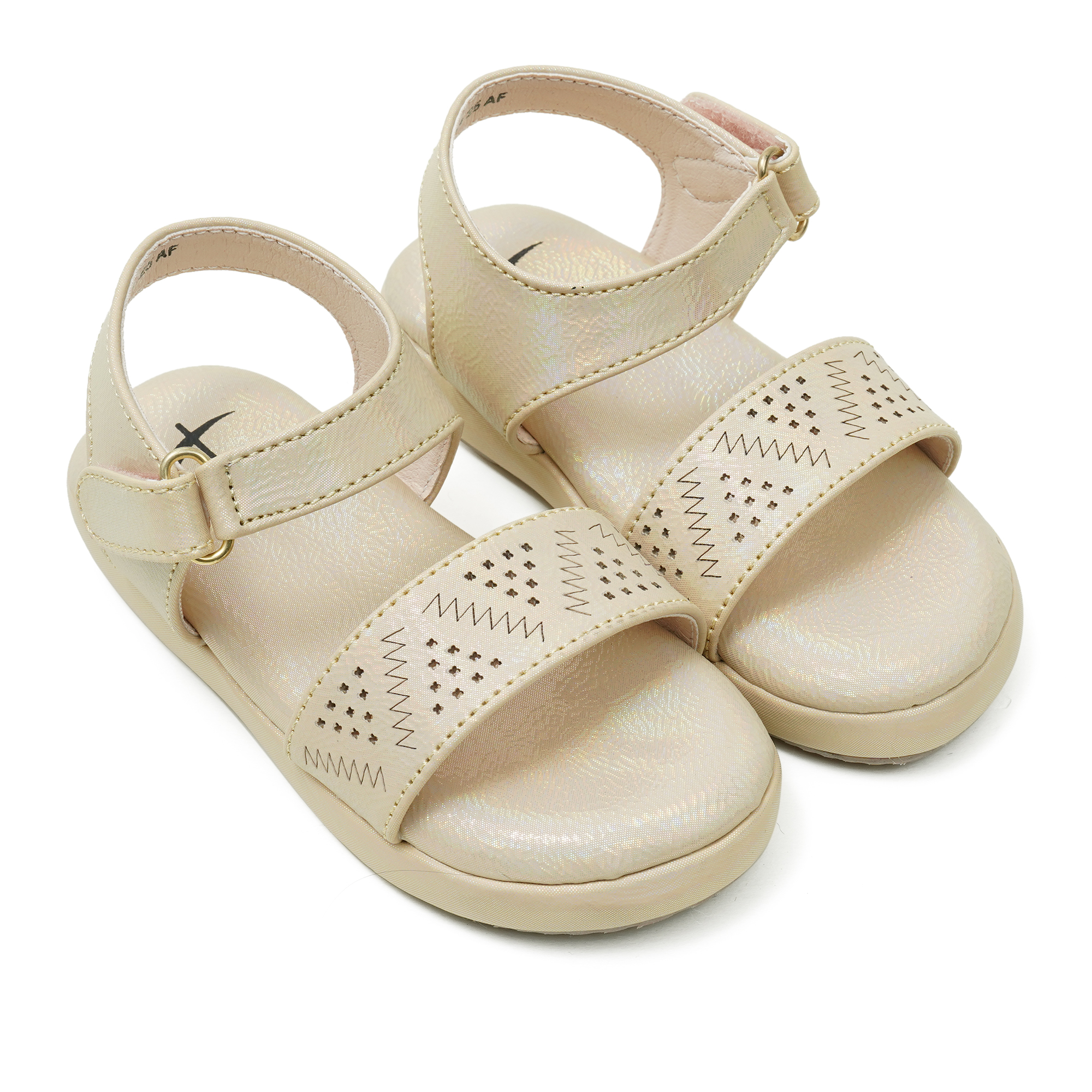 A subtle shimmer and playful perforated pattern give this beige sandal a polished look while the backbelt with easy hook-and-loop closure keeps little feet secure. Padded footbed and flexible sole deliver comfy support for playgrounds, parties, and everyday adventures.