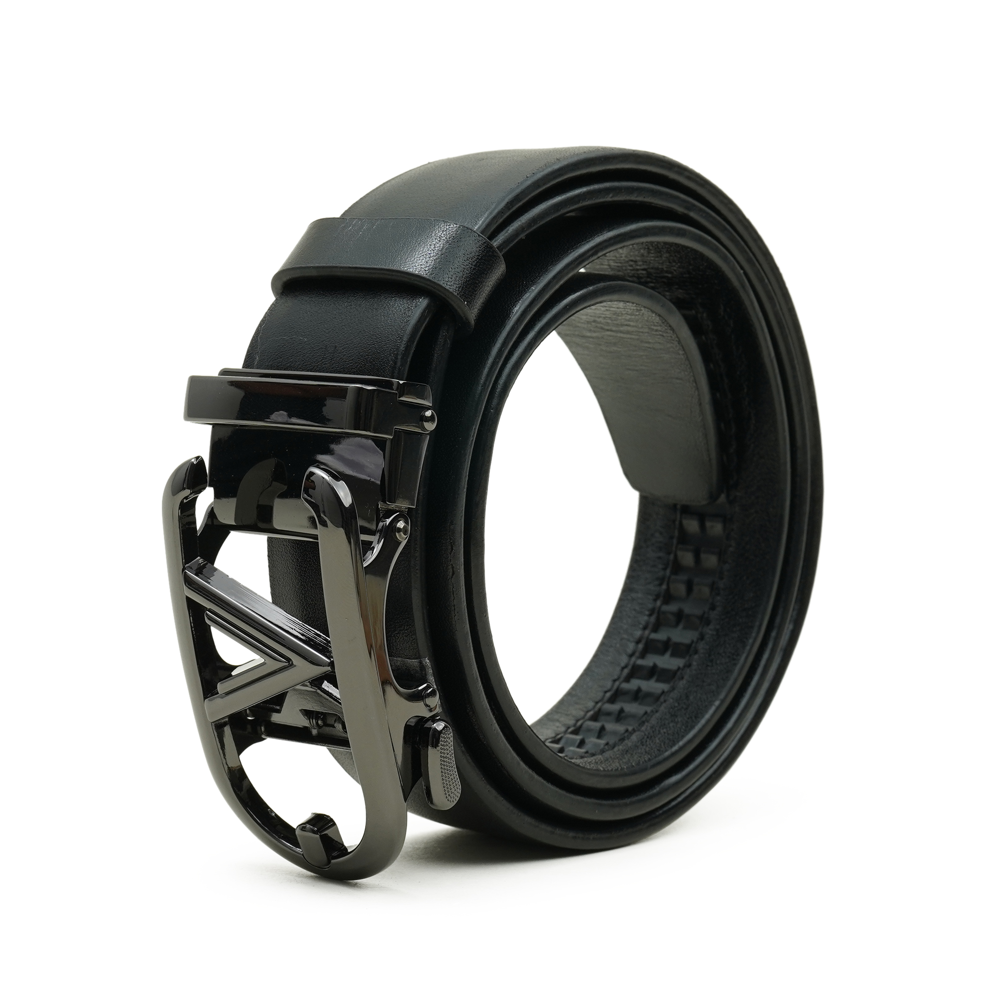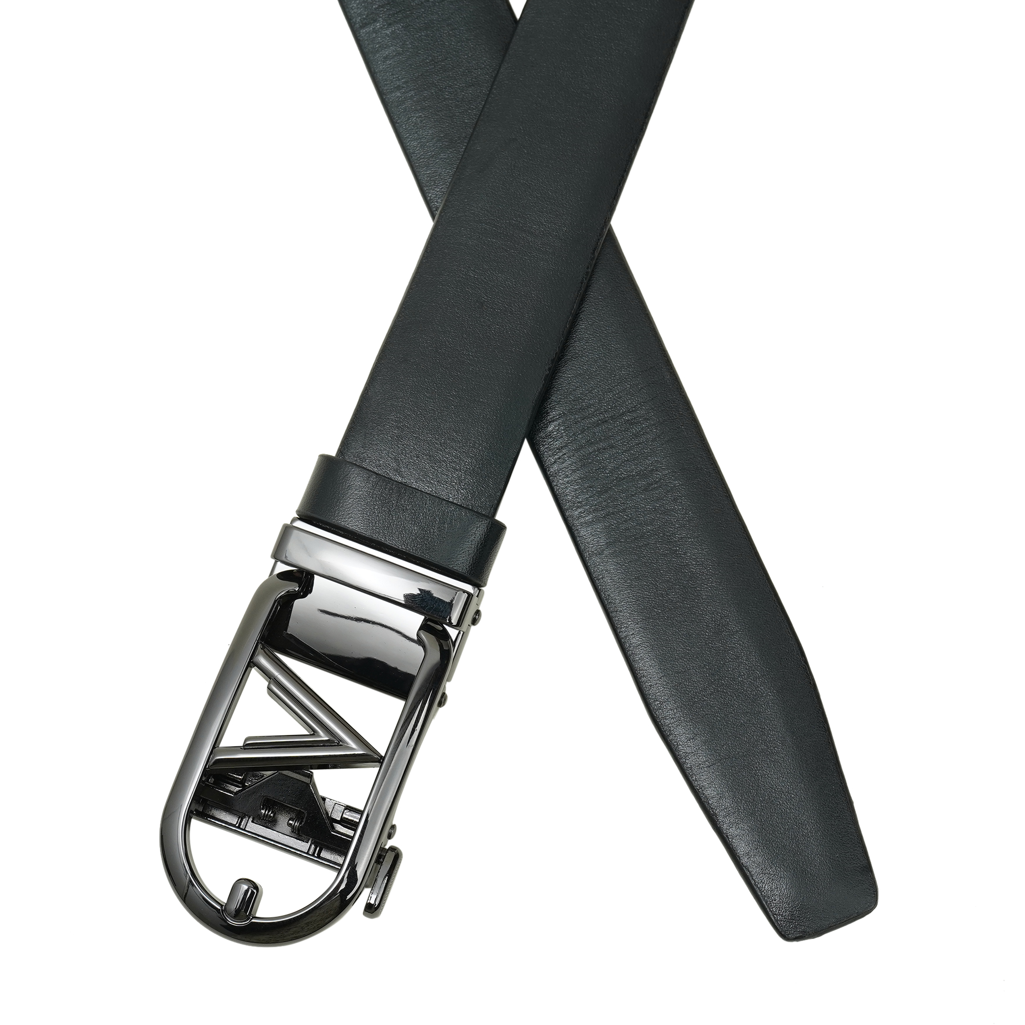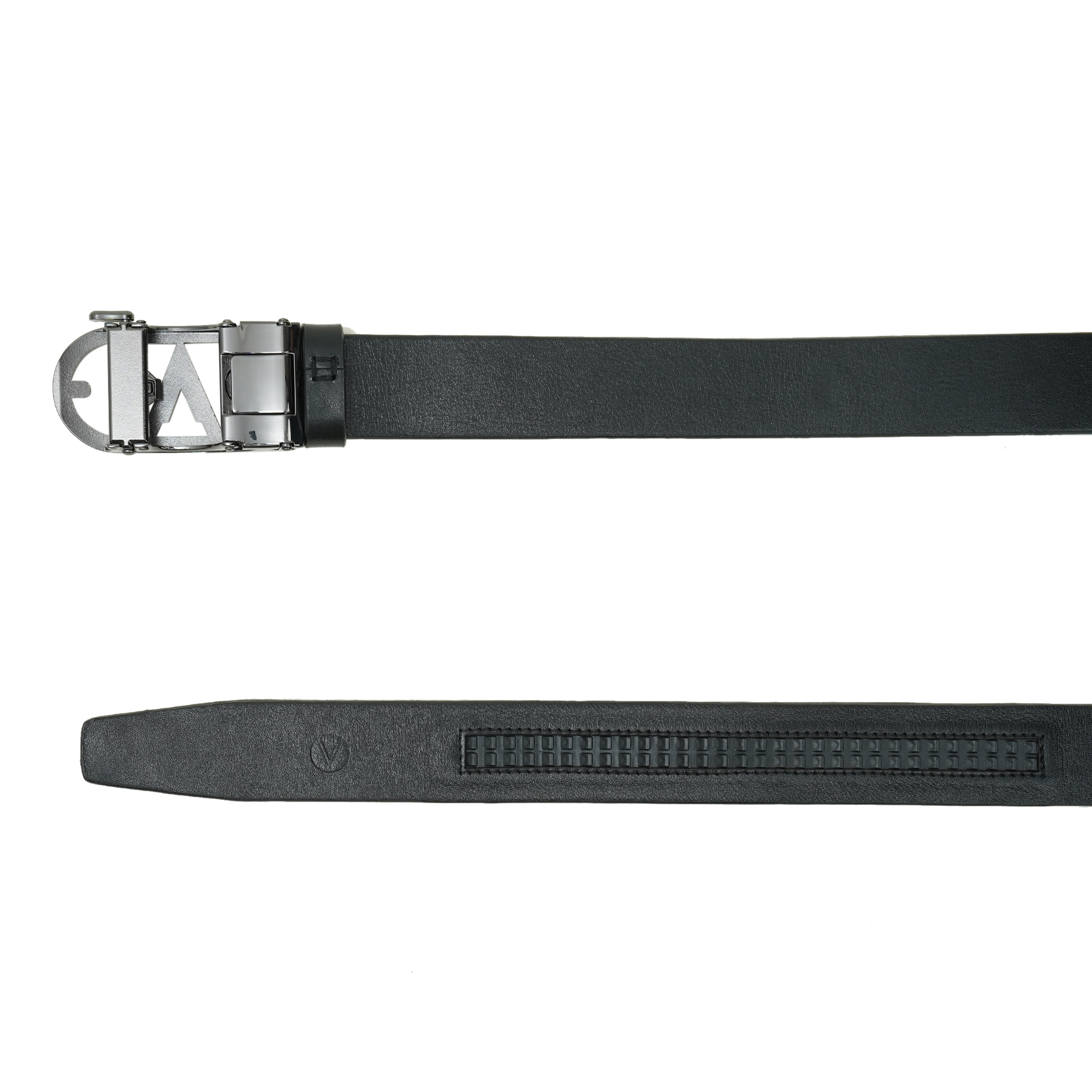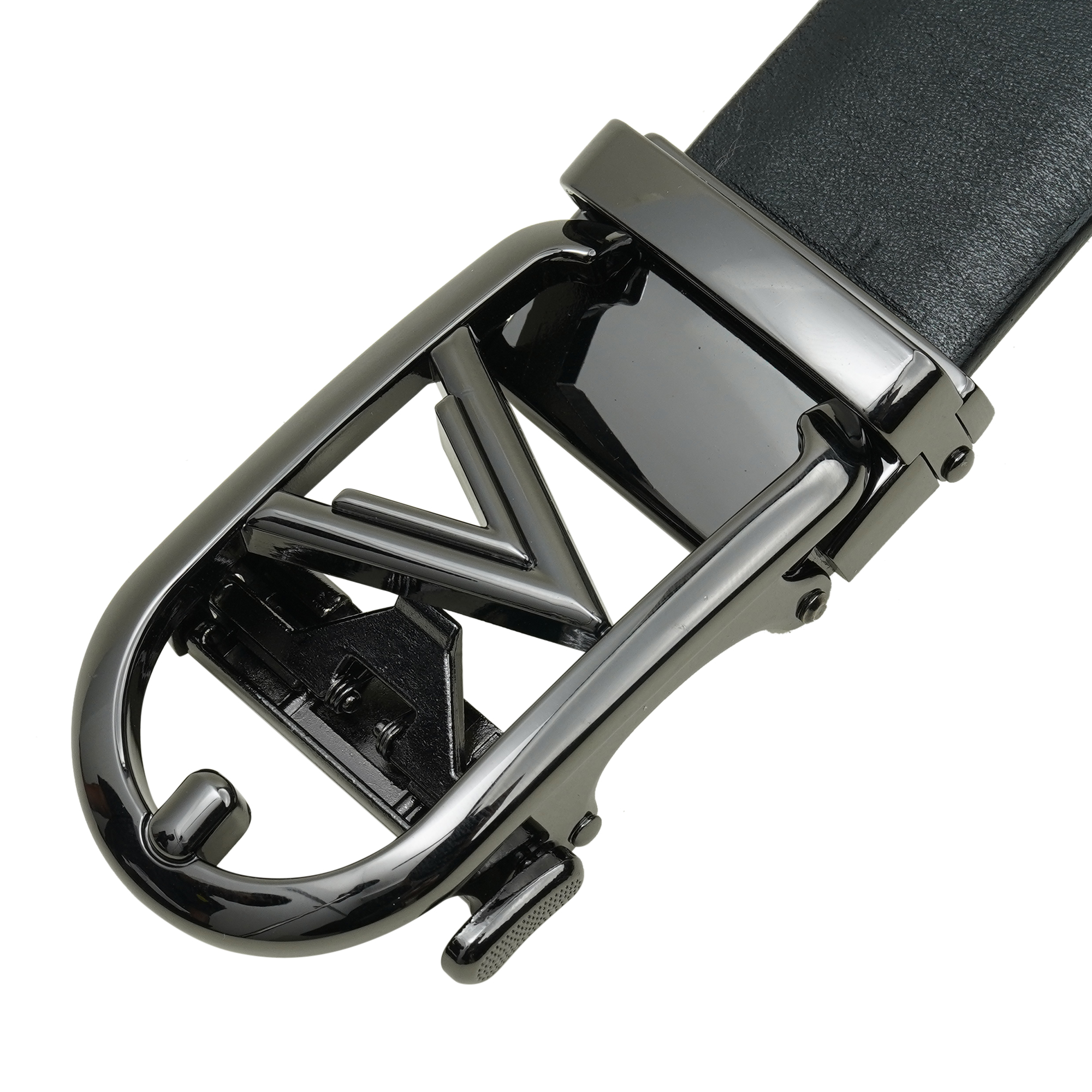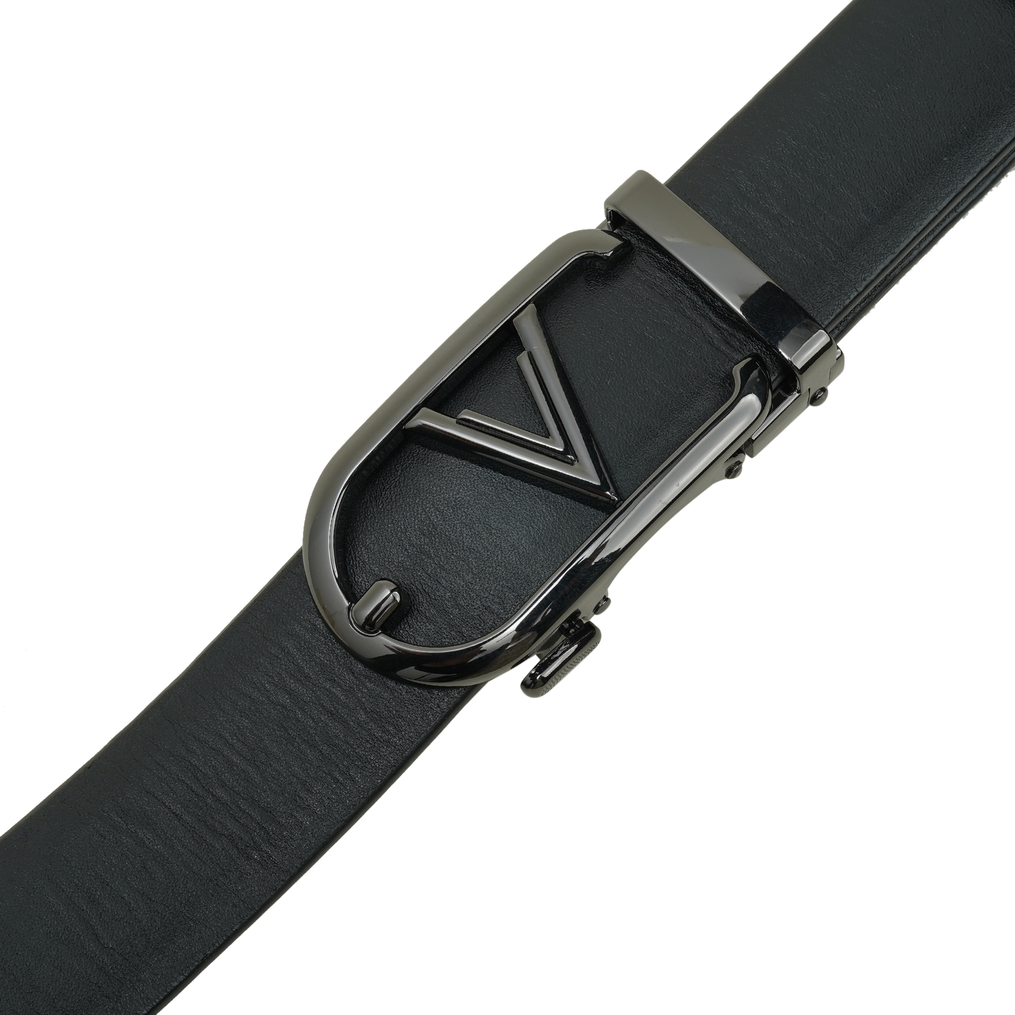 - Signature polished black V-buckle with understated branded detail
