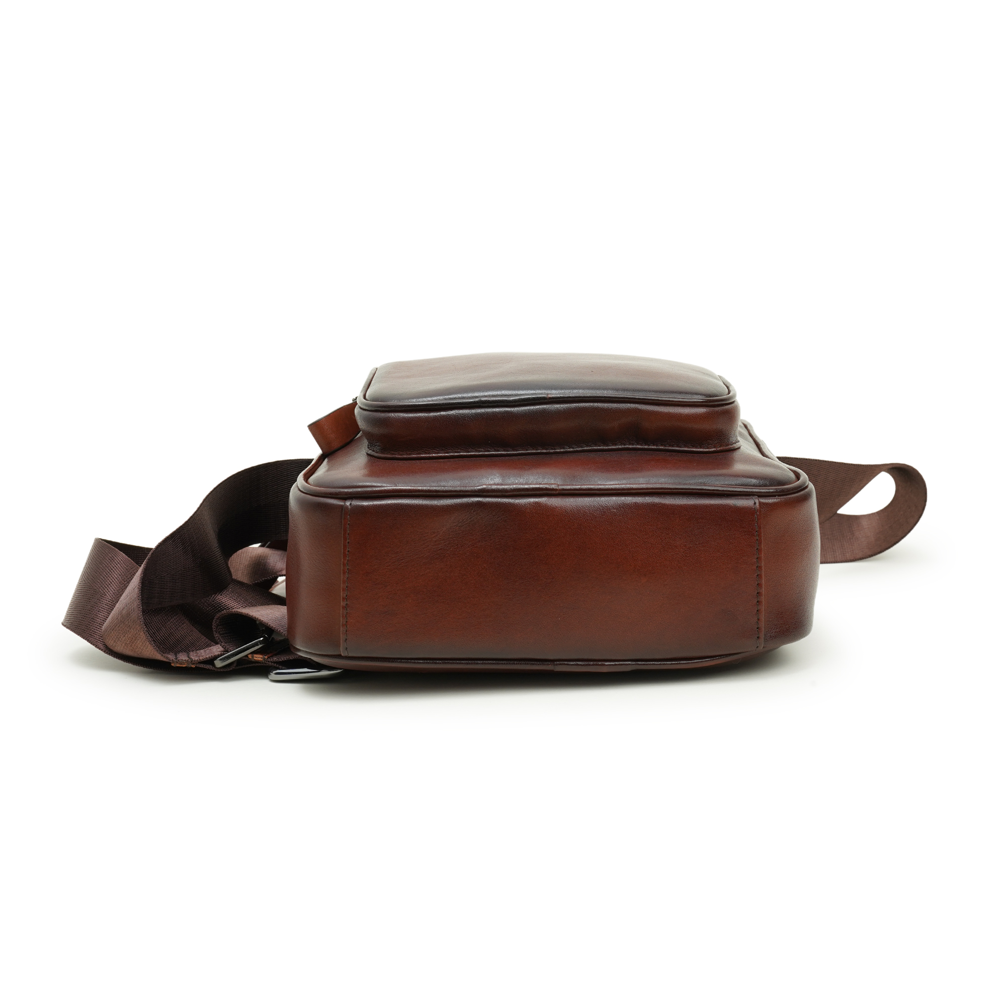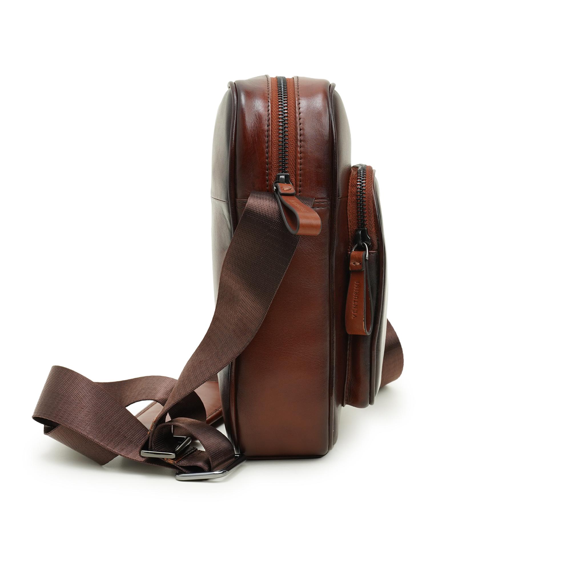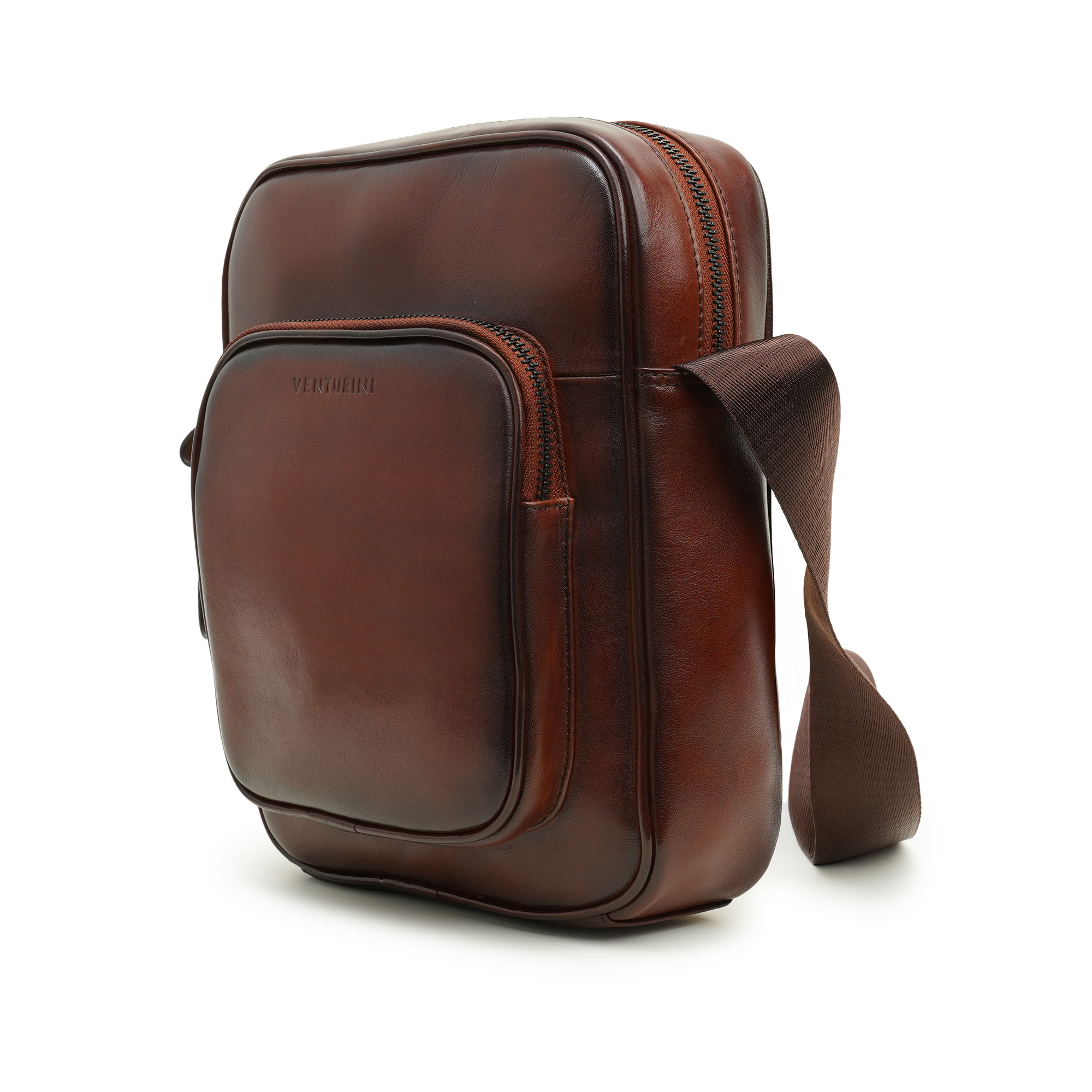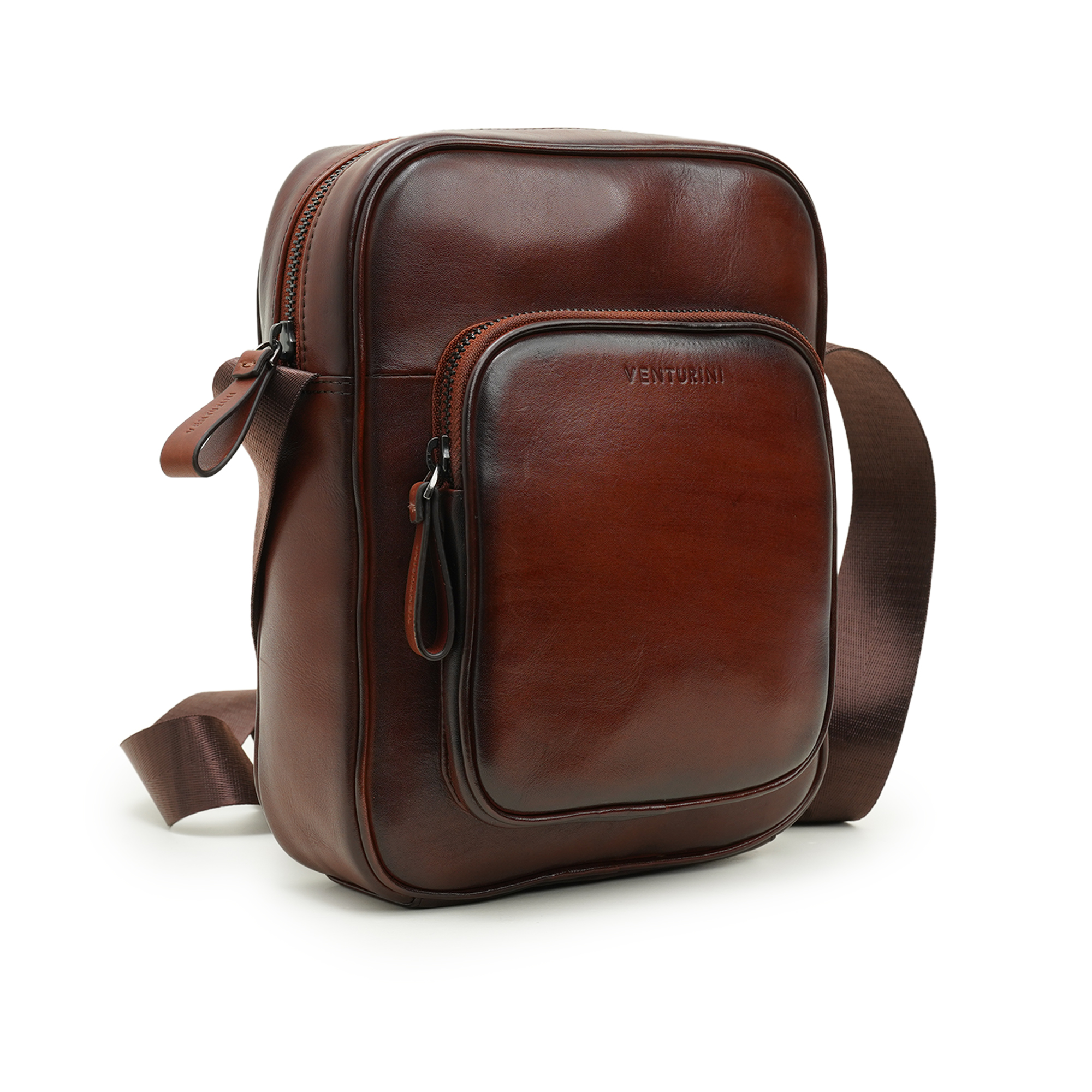 Venturini’s men’s crossbody bag in brown leather is a study in cultivated elegance and purposeful design. Hand-polished leather develops a rich patina over time, reflecting artisanal care and timeless style. The compact, structured silhouette offers organized utility—an easy-access front zip pocket embossed with the Venturini name, a main compartment for essentials, and refined internal pockets to keep items orderly. An adjustable canvas strap provides comfortable, hands-free carry while secure zip closures and quality hardware ensure peace of mind. Ideal for city life or refined travel, this crossbody elevates everyday routines with understated luxury and confident presence.