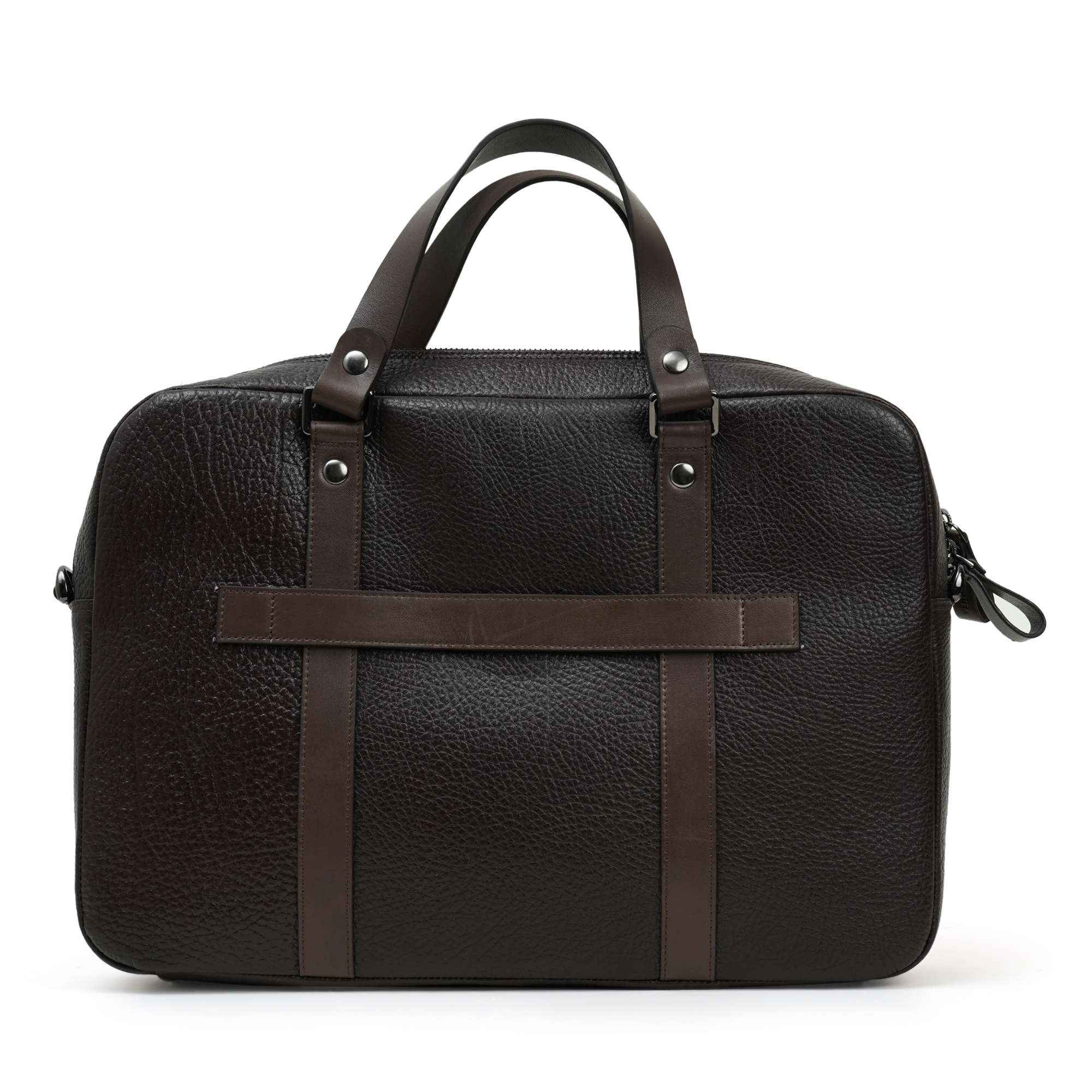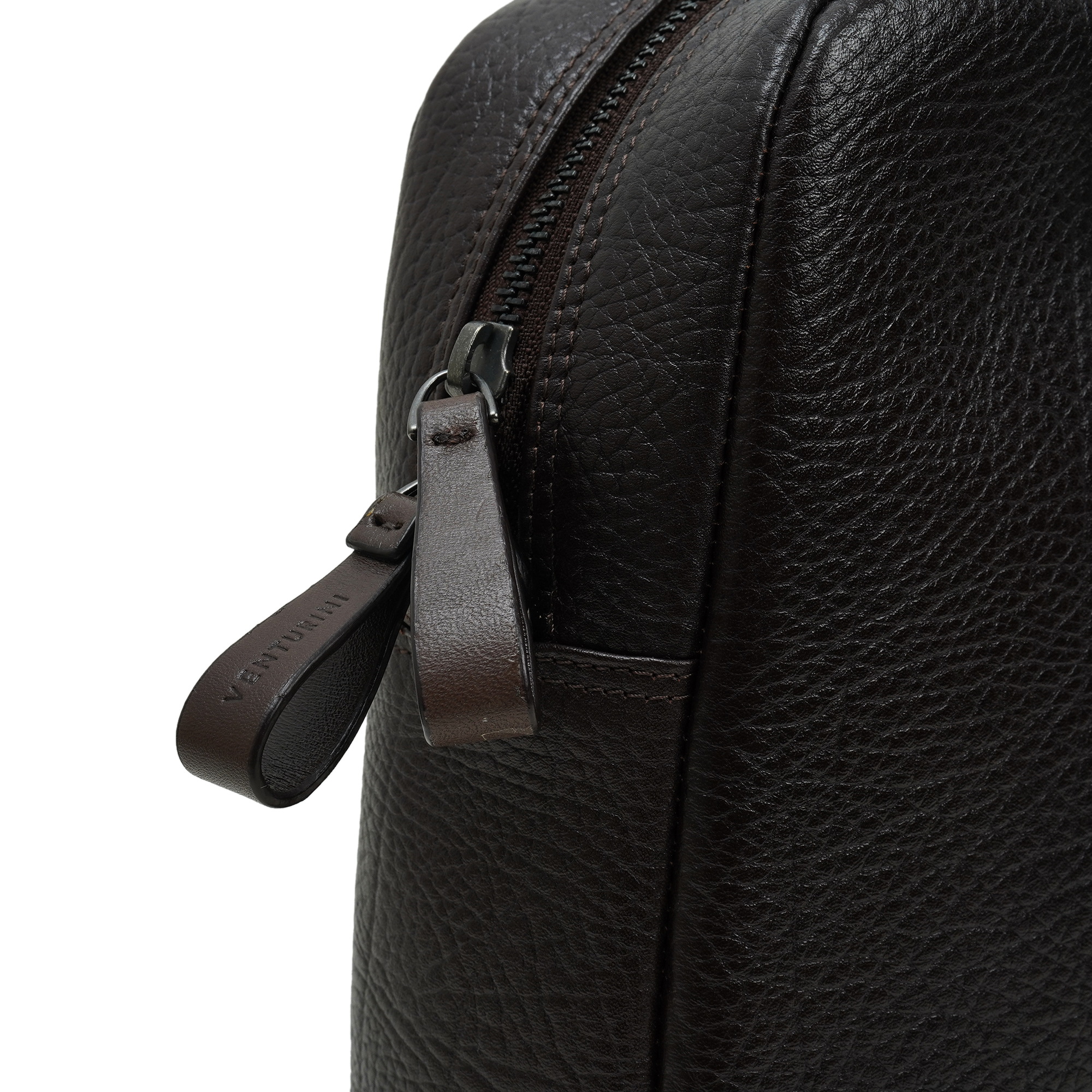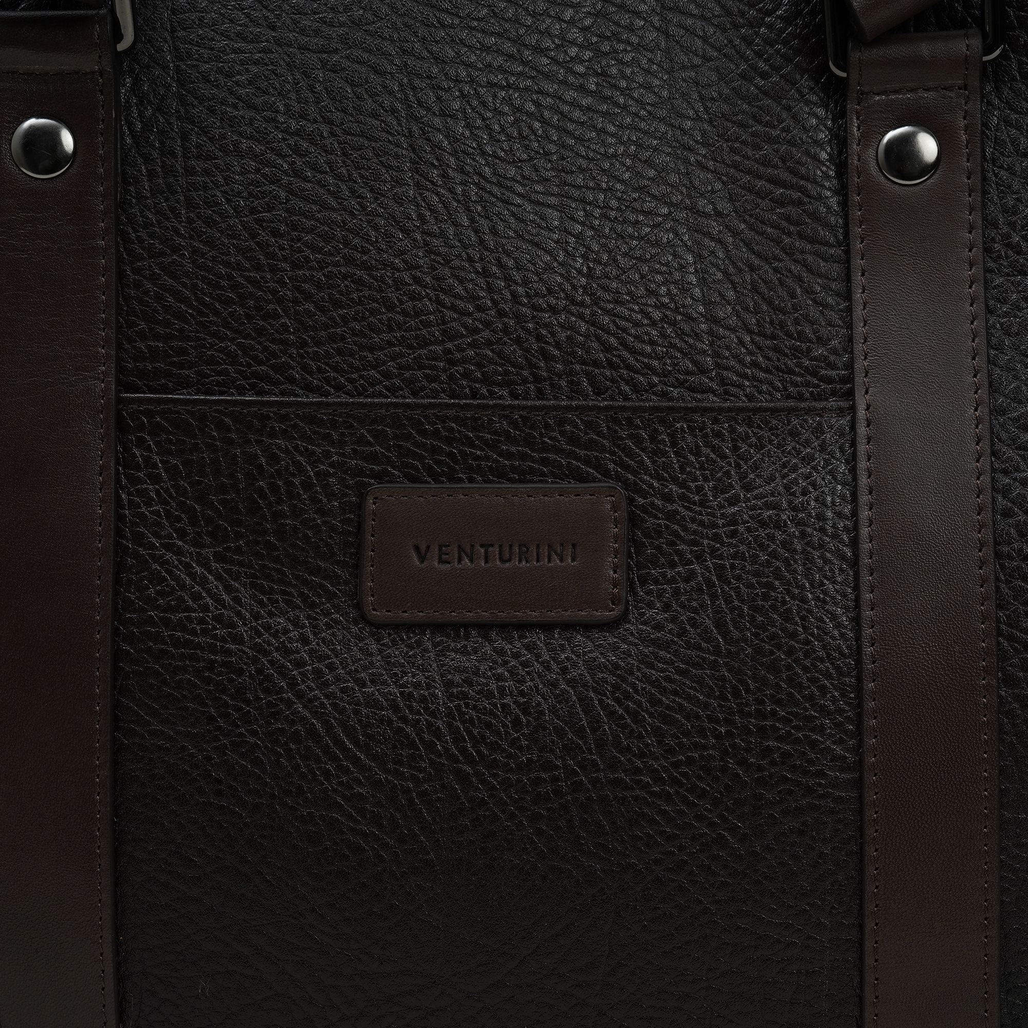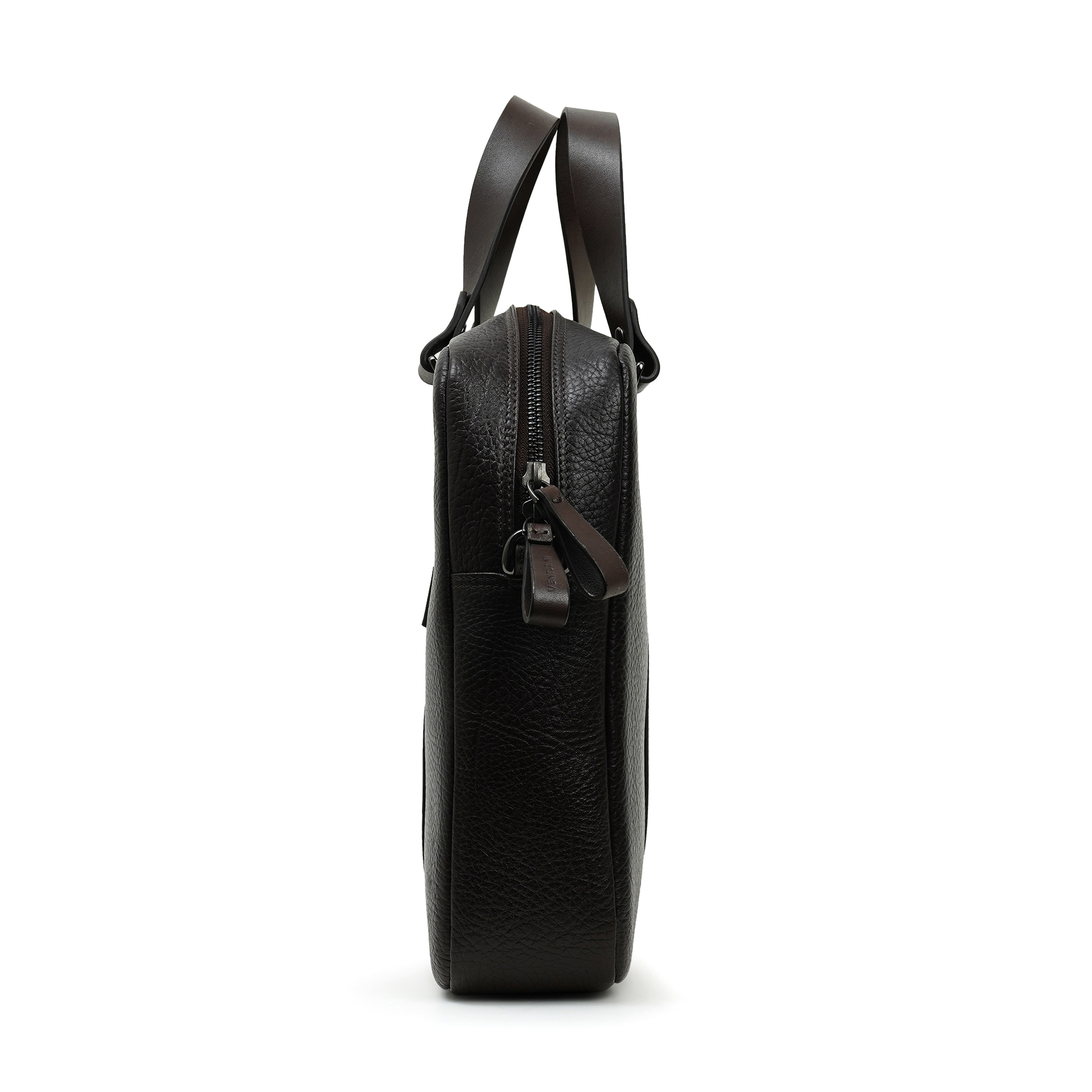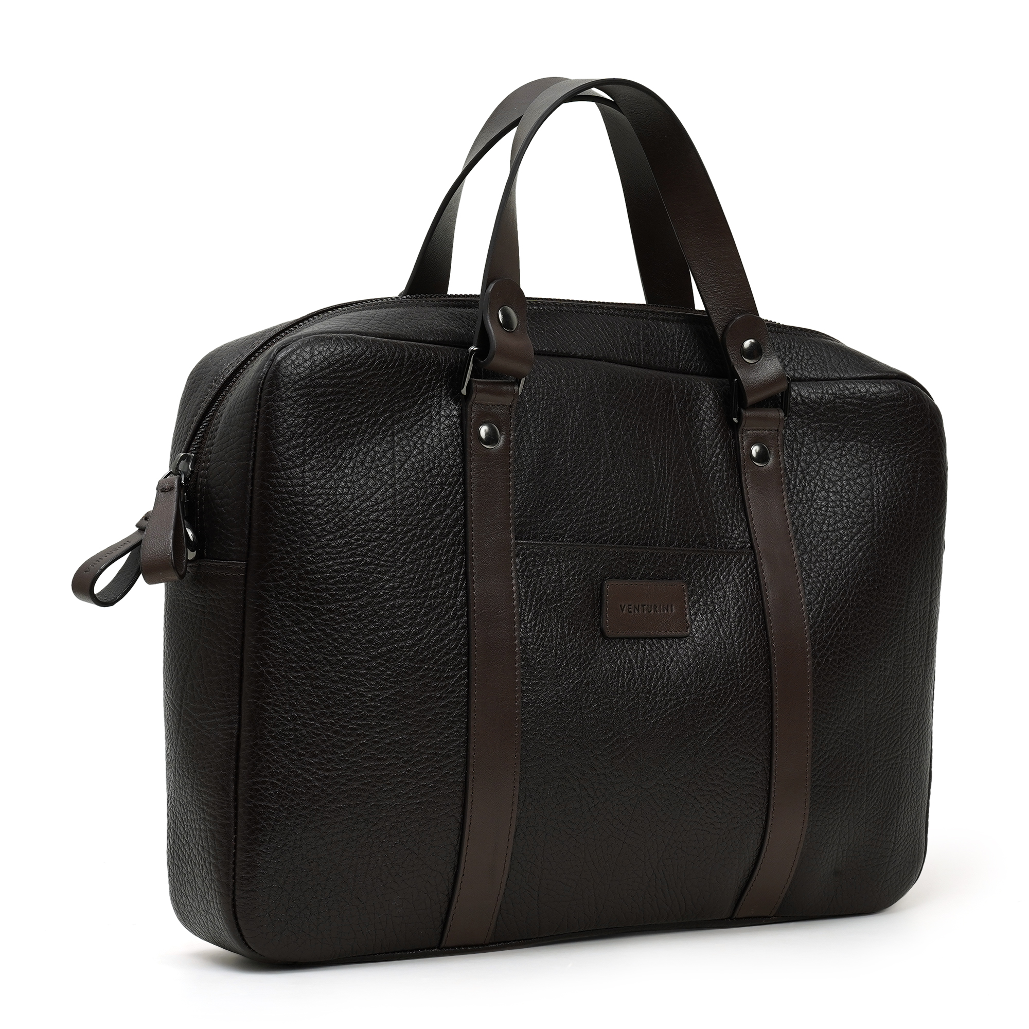 Venturini bag, a stately brown leather briefcase that merges architectural precision with tactile warmth. A quiet, structured form houses a thoughtfully arranged interior with a padded tech sleeve, quick-access pockets and a secure zip compartment. The dual-handled design and understated branding convey confidence and modern taste, making it ideal for boardroom days to meetings and executive errands.